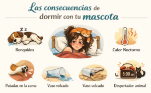 Alteración del sueño Un estudio de la Clínica Mayo (EE.UU.) determinó que las personas que duermen con mascotas tienen una eficiencia de sueño un 15% menor. Los movimientos nocturnos del animal, los sonidos y la ocupación del espacio fragmentan los ciclos de sueño profundo.