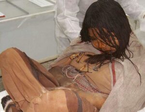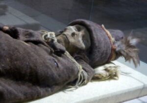 Our third mummy, they’re actually three. In 1999, an expedition located in the Llullaillaco volcano, in northwestern Argentina, the extraordinarily preserved remains of a seven-year-old boy, a girl of six, and a young woman of fifteen. His condition was such that his discoverers claimed that they seemed to be asleep instead of dead. And they were baptized respectively with the nicknames of the child, the girl of the Ray and the Maiden (in the photo).